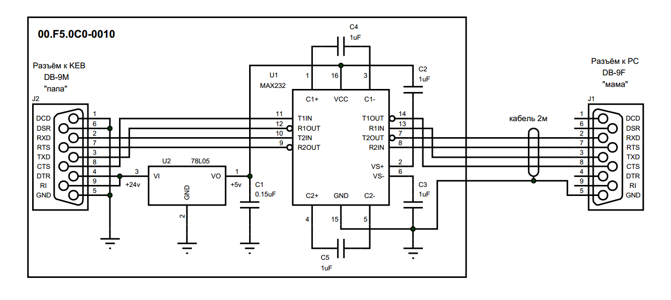 В этой теме приведена схема кабеля (00.F5.0C0-0010) построенного на преобразователе MAX232 (для COM-порта). Там же есть ссылка на статью от поставщика продукции KEB с разъяснением по существующим кабелям и протоколам.